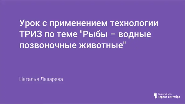 Предлагается разработка урока по теме «Рыбы – водные позвоночные животные» с применением элементов технологии ТРИЗ – теории решения изобретательских задач. Учащиеся учатся работать с текстом, решать биологические задачи, находя в них проблему, противоречие, выдвигая свои гипотезы для решения данной проблемы.