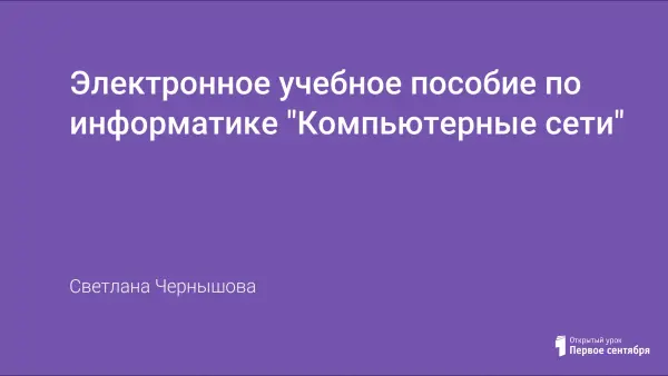 Электронное учебное пособие по информатике "Компьютерные сети" разработано для сопровождения курсов по выбору "Информационные технологии общего назначения", "Компьютерные сети и телекоммуникации" для учащихся 9-х классов, для углубления знаний учащихся на уроках информатики по данной теме, для подготовки к экзамену по информатике. Для повышения качества визуальной информации и как следствие, повышения успеваемости и качества по предмету.