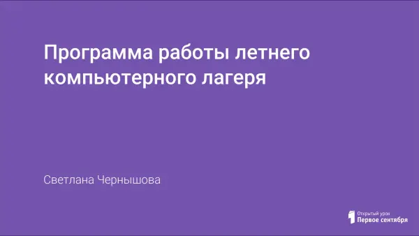 Программа работы летнего компьютерного лагеря направлена на приобретение учащимися конкретных навыков использования современных информационных технологий. Компьютерный лагерь - это прекрасная возможность сочетать активный отдых с освоением компьютерных технологий в непринужденной обстановке и в компании увлеченных сверстников.