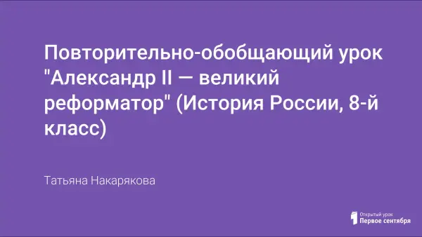 Повторительно-обобщающий урок закрепляет знания о личности Александра II, его реформах и их значении для развития России, формирует интерес к историческому прошлому, создает условия для развития у учащихся интеллектуальных и практических умений в изучении истории. На уроке использованы различные контрольные задания: портретная галерея, кроссворд, деформированный текст, тест на знание фактов, понятий, на установление причинно-следственных связей.