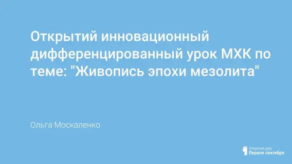 Интегрированный (литература, история, музыка, рисование) урок-путешествие с использованием новых информационных технологий позволяет сформировать представление о характерных особенностях живописи эпохи мезолита (в сравнении с живописью эпохи палеолита); ввести понятие «пиктограмма»; проследить эволюцию художественного сознания первобытного человека на примере живописи эпохи мезолита; развивать навыки элементарного анализа художественного образа с опорой на вопросы учителя.