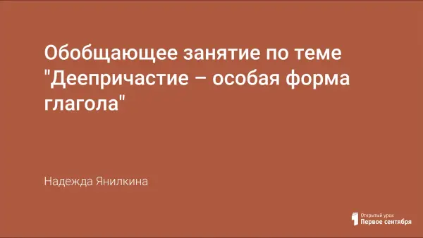 Обобщающий урок по теме "Деепричастие - особая форма глагола", проведённый в форме игры-путешествия, позволяет научить ребят применять свои знания в необычной учебной ситуации, укрепить, углубить их за счёт привлечения занимательного материала. В ходе урока повторяются и закрепляются теоретические знания и практические умения по большинству орфограмм этой темы. Использование на уроке компьютера, индивидуальной, групповой и коллективной форм работы, в том числе тестов и кластера, делают его ещё более интересным.