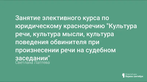 Предлагается план занятия элективного курса по юридическому красноречию: "Культура речи, культура мысли, культура поведения обвинителя при произнесении речи на судебном заседании".
