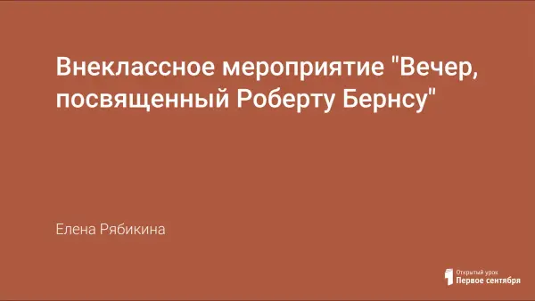 Внеклассное мероприятие по английскому языку, посвященное Роберту Бернсу, знакомит учащихся с жизнью и творчеством шотландского поэта, развивает познавательные способности, способствует формированию социокультурной компетентности учащихся среднего звена.