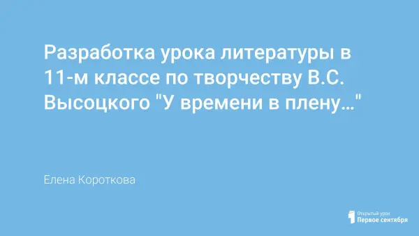 Урок литературы по творчеству В.С. Высоцкого может быть проведен в классах с углубленным изучением предмета и как внеклассное мероприятие для старших классов средних образовательных учреждений. В подготовке данного урока использовались реальные ответы учащихся на уроке. Для удобства при работе с техническими средствами советуем сделать запись на современных информационных носителях.