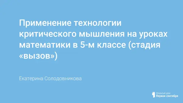 Перед учителями математики стоит трудная задача - нам необходимо обучить всех учащихся, не выделяя тех, кому дано знать математику, а кому не дано. Существует ли и как найти такую «универсальную» технологию, которая бы обучила всех и сразу? Мы долго думали и решили применить на уроках технологию развития критического мышления, тем более что вся школа работает, используя данную технологию. В технологии критического мышления основной упор делается на то, что учащиеся сами будут определять, что они хотят узнать на этом уроке, для чего это им нужно. Я постараюсь описать некоторые моменты применения данной технологии на своих уроках, на стадии «вызов».