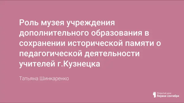 В данной статье мы акцентируем внимание на значимости сохранения у подрастающего поколения исторической памяти о созидательном труде многих поколений педагогов на благо развития детей и образования, роли музея учреждения дополнительного образования в выполнении этой миссии. Раскрывая роль музея в образовательном процессе школы, А.О.Таушканова отмечает, что его воспитательная функция состоит в том, что он создает особую образовательную среду для формирования у учащихся целостного отношения к культурно-историческому наследию [4]. По мнению данного автора, музей в силу своих специфических возможностей способен дать эмоционально-оценочные знания о культурно-историческом прошлом, преобразовав их с систему ценностных отношений обучающихся. Мы остановимся на деятельности музея Дома детского творчества №1 в сохранении исторической памяти о прошлом поколении учителей Кузнецка и их последователей – поколении современных педагогов.