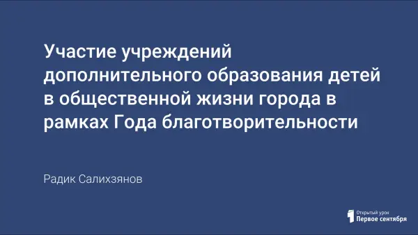 Важную роль в организации единого воспитательного пространства, расширении возможностей для общественно полезной, разнообразной творческой деятельности играют учреждения дополнительного образования детей. Одним из таких учреждений является Дворец творчества детей и молодежи имени И.Х. Садыкова г.Нижнекамска. В 2007 году ДТДиМ принимал участие в совместной благотворительной деятельности с детскими общественными организациями, с промышленными предприятиями и учреждениями города. Так, с участием городского Совета старшеклассников проведены семь благотворительных ярмарок и собрано около 400 тысяч рублей.