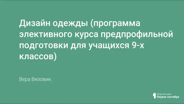 Программа элективного курса "Дизайн одежды" предназначена для предпрофильной подготовки обучающихся 9-х классов с ориентацией на художественно-эстетический и технологический профили, рассчитана на 18 учебных часов. Актуальность программы определяется тем, что профессия дизайнера является одной из привлекательных профессий для выпускников школ, т.к. она становится сегодня всё более востребованной. Цель курса: познакомить девятиклассников с одним из направлений дизайна - дизайном одежды, помочь определиться с выбором профиля обучения.