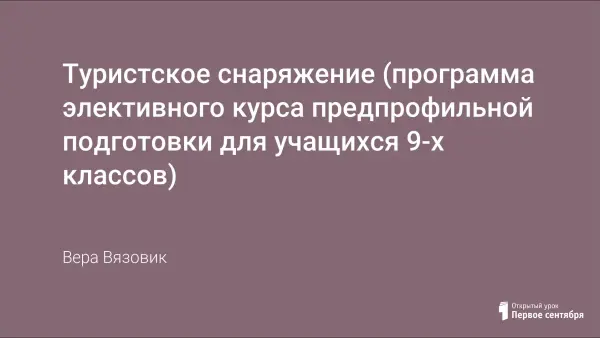 Программа курса предназначена для предпрофильной подготовки обучающихся 9-х классов с ориентацией на оборонно-спортивный и технологический профили, рассчитана на 18 учебных часов. Цель курса - познакомить девятиклассников с различными видами туристского снаряжения и изготовить 1–2 изделия, необходимых в походе.