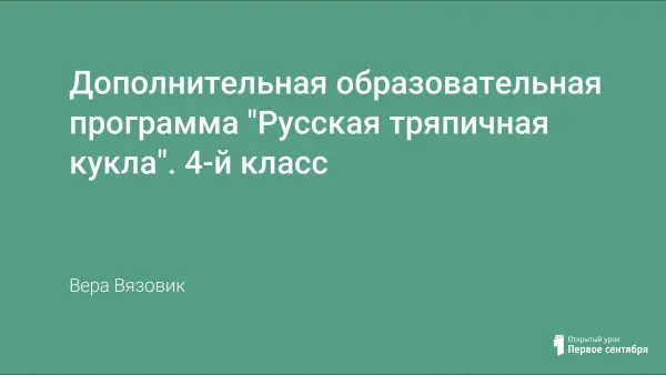 Программа прививает интерес и любовь к русской тряпичной кукле как виду народного художественного творчества через изготовление образцов кукол и представляет собой дополнительное образование по художественно-эстетическому направлению внеурочной деятельности.