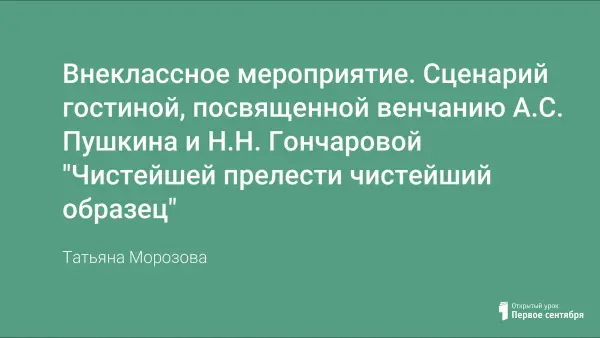 Данную гостиную, посвященную венчанию А.С. Пушкина и Н.Н. Гончаровой, можно проводить с учащимися 8–11-х классов при изучении творчества А.С. Пушкина. В гостиной рассматривается и живопись, в частности творчество А.Брюллова, и музыка - это использование композиции Сен-Санса "Царевна Лебедь" и "Баллада для Аделины" Сенессиля, и композиция "Метель" Г.Свиридова по одноименной повести А.С. Пушкина. При подготовке использовалась переписка А.С. Пушкина с Н.Н. Гончаровой, в которой раскрывается трепетное отношение к женщине, жене, что, несомненно, способствует формированию у подрастающего поколения ценности семьи.