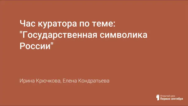 Занятие предполагает знакомство с историей возникновения и развития государственных символов России: герба, флага, гимна. Рассказ ведет куратор группы или студенты, участвовавшие в подготовке к занятию, с использованием мультимедийной презентации. Поиск материала и разработка презентации велась студентами под руководством преподавателей истории и информатики.