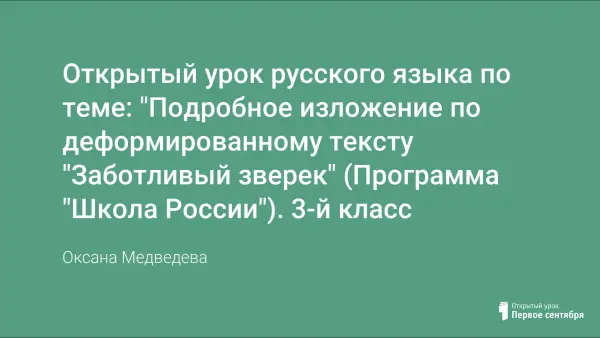 Данный урок проводится в 3-м классе по программе "Школа России". Одна из основных задач уроков русского языка в начальных классах - развитие речи. Дети учатся наблюдать, видеть, думать на каждом уроке. Но главное – они должны научиться выражать свои мысли словом. Для этого на уроках необходимы речевые упражнения, устные и письменные. Одним из важных видов таких упражнений является пересказ текста. Целью урока является развитие умения определять последовательность частей в повествовательном тексте, отработка навыков написания подробного изложения текста.