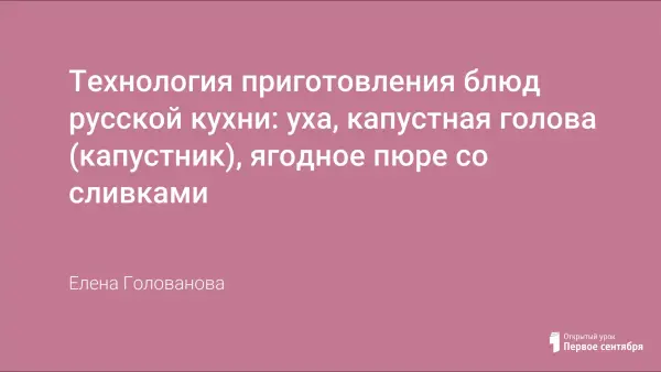 Профессиональное обучение по предмету «Кулинария» из раздела: «Приготовление блюд русской кухни» знакомит с технологией приготовления, оформлением и режимом варки, правилами современной подачи блюд русской кухни: уха, капустная голова (капустник), ягодное пюре со сливками. На уроке идет развитие творческих умений, технологического мышления, памяти, самостоятельности, расширяются познавательные интересы; воспитывается интерес к выбранной профессии.