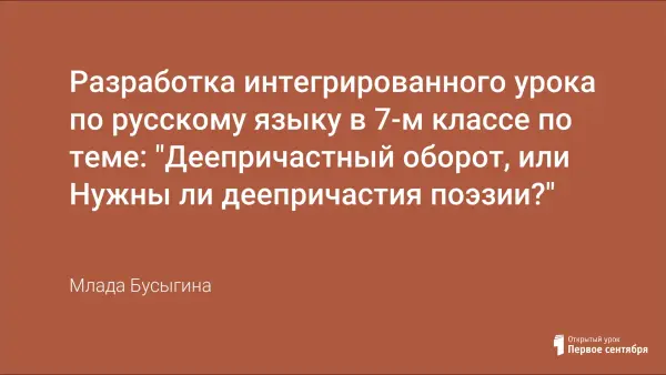 Урок представляет собой интегрированную форму подачи материала по русскому языку (раздел "Деепричастие", 7-й класс) и литературе (поэтические образцы из стихотворений Ф.И. Тютчева). Особое внимание на уроке уделено методам исследования, творческой работе и более глубокому усвоению материала через обращение к классическим образцам русской поэзии, где широко используются в качестве изобразительных средств деепричастия и деепричастные обороты.