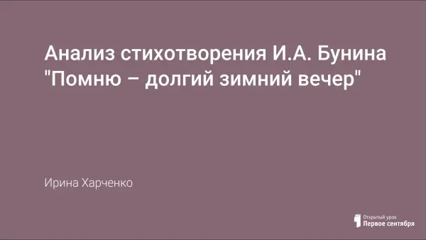 Урок-анализ лирического стихотворения И.А. Бунина в 5-м классе знакомит учащихся с интересными деталями из биографии. Кроме этого учащиеся усваивают отличия поэзии от прозы, развивают умение чувствовать, проникаться настроением стихотворения, видеть красоту, мелодичность стиха. Построчный анализ стихотворения "Помню - долгий зимний вечер" позволяет увидеть развитие авторской мысли, образов, мотивов, состояние лирического героя, изобразительно-выразительные средства. В ходе такого анализа чаще всего удается главное - найти ключ к раскрытию смысла стихотворения.