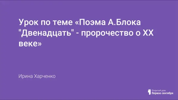 Анализ поэмы А.Блока «Двенадцать» через жанровое своеобразие позволяет проследить за особенностями стилистической реализации стихии революции, определить роль образов-символов и художественных деталей; показать полемический характер поэмы; оценить провидческий характер поэмы; понять многозначительность финала; осознать мироощущение Блока через его вершинное произведение – поэму «Двенадцать». Урок сопровождается презентацией по поэме.