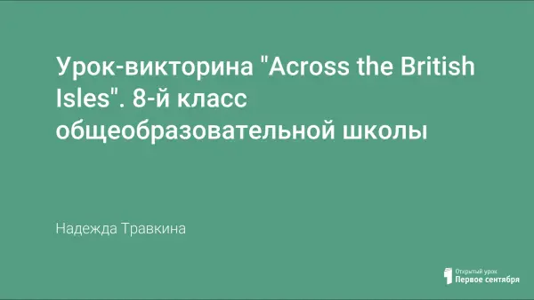 Урок-викторина "Across the British Isles" проводится как обобщающий урок после изучения 4-х тем по учебнику 8-го класса УМК В.П. Кузовлева или как игра в рамках проведения недели английского языка с целью обобщения и контроля усвоения страноведческих знаний о Великобритании.