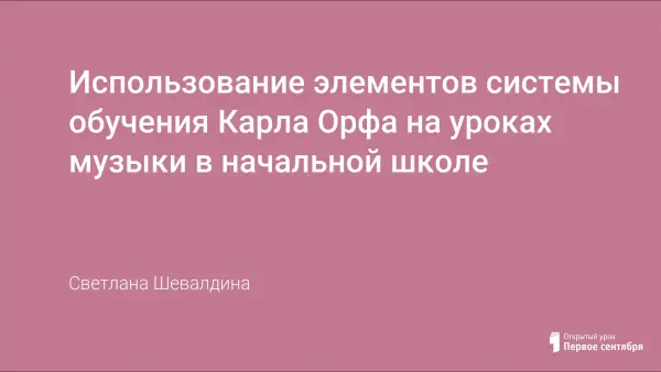 Внедрение элементов системы "Шульверка" в школьную практику преподавания музыки, необходимость обращения к музыкальному материалу своей культуры, русскому фольклору. Подход Карла Орфа интересен и продуктивен. Урок музыки становится "обучением в действии". Ребенок - соавтор и создатель собственного мира. В этом - успешность в обучении и воспитании активной творческой личности, стремящейся совершенствовать окружающий мир.