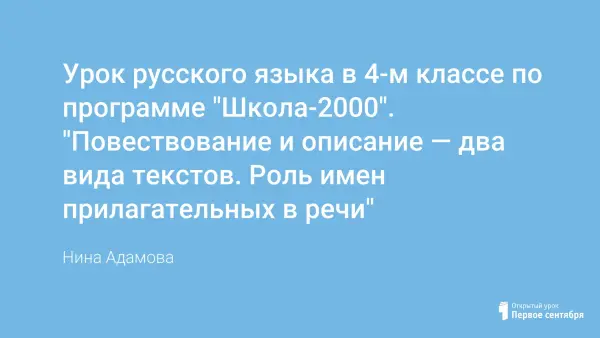 Это первый урок в 4-м классе по теме «Имя прилагательное». На уроке дети находят отличительные признаки текста – описание и текста - повествование, составляют текст-описание по картине И.Э. Грабаря «Февральская лазурь».