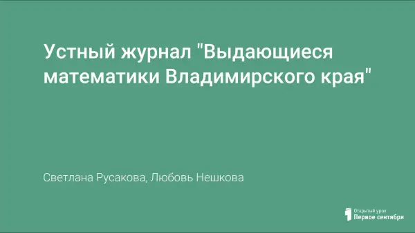 В данной статье представлен устный журнал "Выдающиеся математики Владимирского края", страницы которого рассказывают о жизни и деятельности математиков - уроженцев Владимирского края, внесших большой вклад в развитие математических наук и в совершенствование математического образования в России. При проведении мероприятия использовалась презентация, выполненная в программе Power Point. Устный журнал приурочен к единому Дню краеведения - 6 декабря.