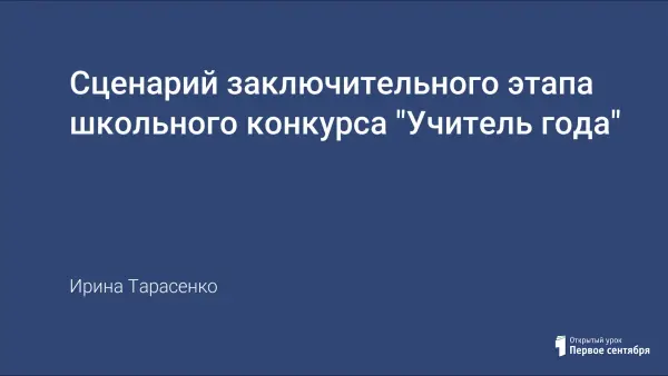 Конкурс – это всегда праздник! Это возможность громко заявить о себе, насущная необходимость поделиться открытиями и впитать опыт других. Конкурс – это особый мир. Мир общения, соревнования, удач и находок. Предлагается сценарий заключительного этапа школьного конкурса профессионального мастерства «Учитель года».
