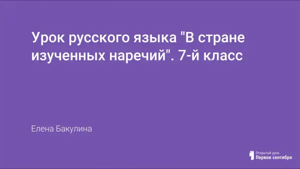 Урок обобщения и систематизации изученного материала по теме «Наречие», на котором устанавливается взаимосвязь между всеми уроками темы; систематизируются знания (общее значение, морфологические признаки, синтаксические функции, правописание наречий); совершенствуются орфографические навыки. Ученики развивают умение находить закономерности в изученном материале; умение анализировать и делать выводы. Урок воспитывает коммуникативную культуру, культуру речи.