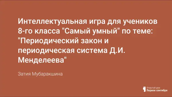 В основе игры лежит телевизионная версия популярной игры «Самый умный». Разработка может быть применена как в качестве формы проведения заключительного урока, так и в виде внеклассного мероприятия в рамках «Недели химии». Ученики, желающие проверить свою эрудицию, расширить кругозор, смогут продемонстрировать знания не только в области химии, но и математики, физики, географии, русского языка.