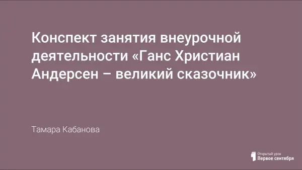 Цель занятия: расширить представления учащихся о жизни и творчестве Г.Х.Андерсена, развивать творческие способности детей, способствовать развитию читательских интересов детей. В ходе подготовки к проведению дети по классам читают сказки Андерсена, выбирают наиболее понравившуюся и готовят иллюстрации к каждому эпизоду, по этим рисункам составляют презентацию, подбирают музыку, получается свой мультфильм.