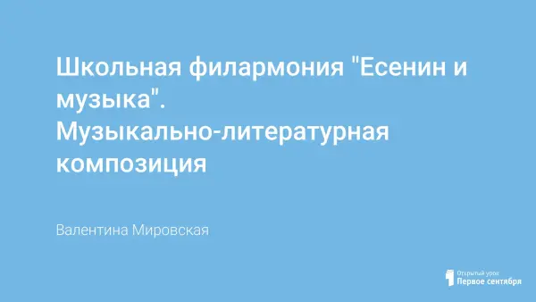 Музыка...О связи её с поэзией, живописью, архитектурой говорит Сергей Есенин в своих литературных очерках, с величавой её торжественностью сравнивает узорные народные вышивки, орнаменты. Поэтическая работа Есенина переплетена с его музыкальными впечатлениями. Музыкальная разработка есенинской поэзии продолжается. Ещё много раз будут композиторы черпать вдохновение из чистого и щедрого источника поэтичности и музыкальности, имя которому - Сергей Есенин.