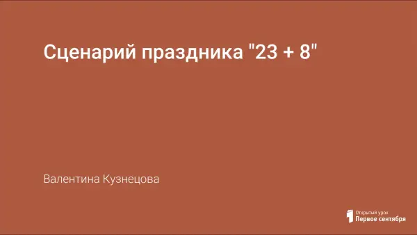 Сценарий праздника "23+8" показывает возможность сближения родителей (как пап, так и мам) и обучающихся, формирует у родителей и их детей духовно-нравственную культуру. Данное внеклассное общешкольное мероприятие направлено на то, чтобы развить у обучающихся и их родителей способность чувствовать, понимать, любить, оценивать явления искусства, наслаждаться ими, создавать в меру своих сил и творческих возможностей музыкально-художественные ценности. Этот праздник проводится в первые дни весны. Приглашаются папы и мамы, активно участвующие в жизни школы.
