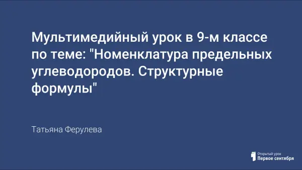 В статье представлен мультимедийный урок для учащихся 9-х классов по теме "Номенклатура предельных углеводородов. Структурные формулы". На примере предельных углеводородов впервые разбирается номенклатура органических соединений и построение структурных формул. Вопросы, рассматриваемые в уроке, являются принципиально новыми, поэтому его содержание раскрывается путём использования ИК технологий, т.к. данная технология позволяет: сократить время обучения и повысить его качество, сделать урок информационно насыщенным, интересным для учеников.