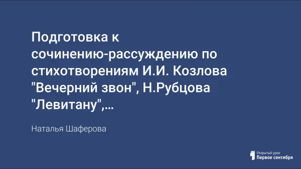 Цели урока: дать новые сведения искусствоведческого характера, познакомив уч-ся со стихотворениями И.И. Козлова "Вечерний звон", Н.Рубцова "Левитану", картиной И.И.Левитана "Вечерний звон"; учить определять основную мысль сочинения и собирать материал по заданной теме; обогащать словарный запас учащихся, учить овладевать выразительными свойствами языка, создавать условия для развития умения формулировать собственную точку зрения, высказывать и аргументировать ее.