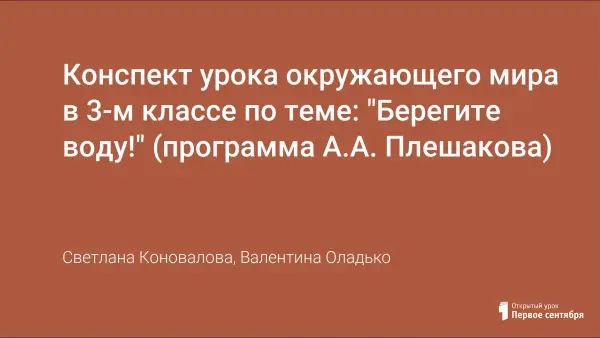 Комбинированный урок усвоения новых знаний, основанный на технологии М.Б. Воловича "Поэтапное формирование умственных действий", включающий в себя материальное действие ученика с реальными предметами. Урок формирует и обобщает знания о воде, явлениях природы (круговорот воды), связанных с водой; раскрывает противоречия между обществом и природой по охране водных ресурсов от загрязнения; помогает приобрести учащимся определенные знания и умения, позволяющие участвовать в практической деятельности по охране воды в природе.