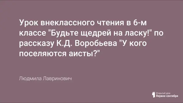 Урок проводится в 6-м классе как урок внеклассного чтения. Дети открывают новое для себя имя в художественной литературе – К.Д. Воробьёв и размышляют над рассказом «У кого поселяются аисты?». Большое внимание на уроке уделяется развитию творческих способностей учащихся.