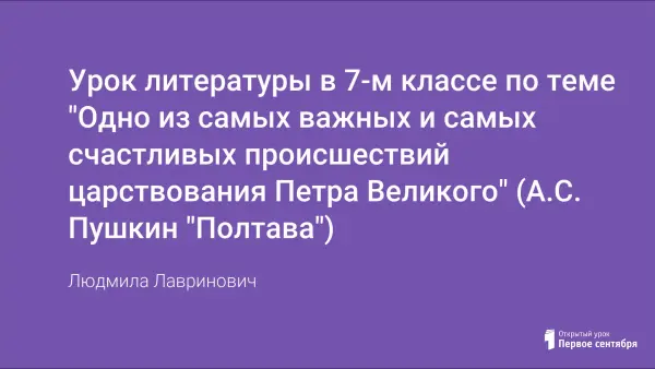 Урок литературы в 7-м классе проведен в форме ролевой игры. Чтобы обучающие правильно поняли произведение, на этом уроке, необходимо ввести их в мир исторических реалий поэмы, показать, что тема Петр I всегда вызывала особый интерес у поэта, познакомить учащихся с фактической стороной описания Полтавского боя и с его поэтическим воспроизведением. Материал урока объемный, поэтому форма ролевой игры, по-моему, самый оптимальный вариант для того, чтобы он был успешно усвоен.