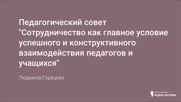 Тема педсовета «Сотрудничество как главное условие успешного и конструктивного взаимодействия педагогов и учащихся или школа без агрессии», на котором предстоит ответить на вопрос: «Как в столь воинственно настроенном мире помочь ребенку избежать проявления агрессии как с его стороны, так и в его сторону?»