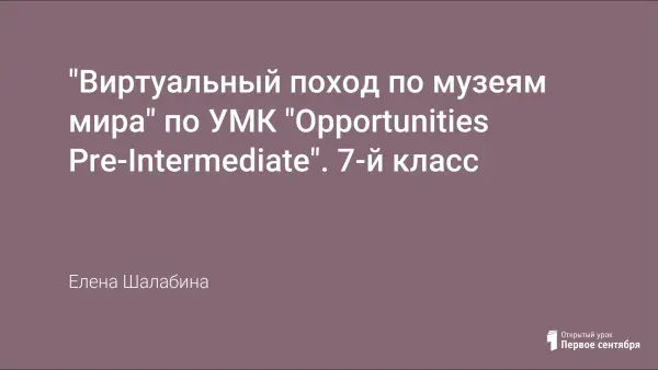 Урок-экскурсия по самым известным музеям Санкт-Петербурга, Парижа, Лондона, Нью-Йорка, Мадрида. Расширяется кругозор учащихся, совершенствуются языковые навыки. Отрабатываются умения описывать и выделять главное в картине, видеть прекрасное, выражать свои мысли и отстаивать свою точку зрения. На экране появляются фотографии музеев, картины разных жанров, звучат стихи и музыка. На уроке используется мультимедийное приложение «Виртуальный Эрмитаж».
