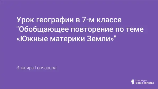 Обобщение материала организовано как нетрадиционное занятие по содержанию учебного материала в виде игры-путешествия по южным материкам Земли с привлечением тех знаний и умений, которые детям уже знакомы. На уроке применяются групповая и индивидуальная работа, межпредметные связи, игровые ситуации, различные виды деятельности учащихся с различными источниками географической информации (применение картосхем, проектная деятельность, грамзаписи, беседа по угадыванию географических объектов, работа с картосхемами, рисунками, диаграммами и др.).