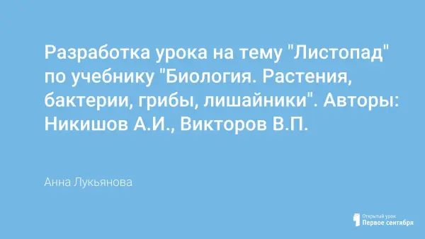 Разработка по теме: "Листопад" (по учебнику "Биология. Растения, бактерии, грибы и лишайники"; авторы: Викторов В.П., Никишов А.И.) предназначена для проведения урока биологии в 6-м классе. Данный урок является последним при изучении раздела "Процессы жизнедеятельности растений".