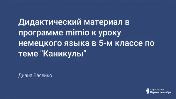 Дидактический материал "Каникулы" разработан для урока немецкого языка в 5-м классе (в рамках УМК И.Л. БИМ и др. "Немецкий язык"). Он предназначен для работы на интерактивной доске, работающей в программе mimio. Включает в себя упражнения на повторение изученной лексики по теме, знакомство с новыми выражениями, повторение образования прошедшего времени Perfekt и опорную схему для устного высказывания по теме "Мои каникулы". В файле "Статья" содержатся методические рекомендации по работе с материалом.