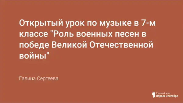 Урок дает возможность показать учащемуся, какую немаловажную, огромную роль сыграла музыка в победе в Великой Отечественной войне. Она поддерживала солдат, поднимала настроение, в песнях была сама победа над врагом, так как песни были написаны людьми, которые тоже пережили годы страданий и потерь. Ребята сами проводят исследовательскую деятельность, кем, как, когда были написаны песни до войны, во время войны, после войны.