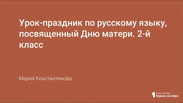 Урок посвящен Дню матери. На него приглашены мамы. Празднично украшен класс. Урок проходит в доброжелательной праздничной атмосфере. Ученики показывают мамам свои знания и работу на уроке. У детей воспитывается чувства любви и уважения к матери. На уроке дети учатся поздравлять мам с праздником, вручают им подарки, сделанные своими руками. Мамы, в свою очередь, проявляя заинтересованное отношение к учебе детей, дарят подарок классу.