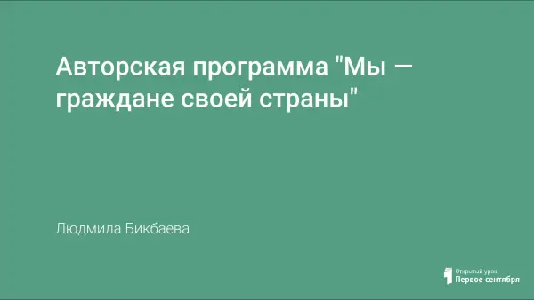 Выбор темы моей авторской программы "Мы - граждане своей страны" не является случайным. Актуальность данной темы в современном обществе не вызывает сомнений. Воспитание гражданина не только социальная проблема, но и важная задача учителя. Проводя параллель с нынешним временем, стоит вспомнить, что "любовь к родному краю, родной культуре, родной речи начинается с малого - с любви к своей семье, к своему жилищу, к своей школе. Постепенно расширяясь, эта любовь переходит в любовь к родной стране, к её истории, прошлому и настоящему, ко всему человечеству". Так писал академик Д.С. Лихачёв.