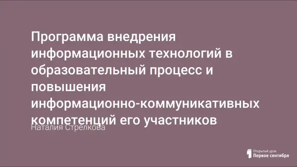 Представлена программа по информатизации учебно-воспитательного процесса в ОУ. Программа разработана в 2006 г. на основе результатов опытно-эксперементальной деятельности педколлектива и включена в общую программу развития школы до 2010 г. В 2007 г. школа стала победителем национального проекта «Образование». Осуществление данного проекта позволило вывести учебно-воспитательный процесс на новый качественный уровень.