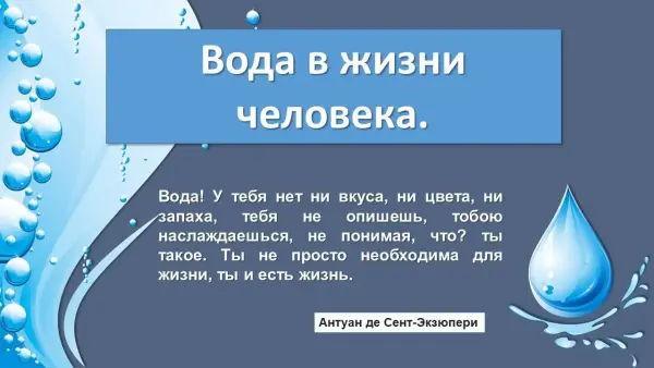 Вода! У тебя нет ни вкуса, ни цвета, ни запаха, тебя не опишешь, тобою наслаждаешься, не понимая, что? ты такое. Ты не просто необходима для жизни, ты и есть жизнь. (Антуан де Сент-Экзюпери)