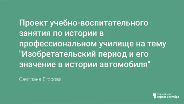 Проект учебно-воспитательного занятия на тему: "Изобретательский период и его значение в истории автомобиля" разработан с целью реализации взаимосвязи общеобразовательных и профессиональных знаний на уроках истории в учреждении НПО. Данный урок - один из серии взаимосвязанных уроков, на которых эволюция транспортных средств рассматривается в контексте общего хода НТП. Содержание урока связано с будущей профессией учащихся - слесарь по ремонту автомобилей. Материал урока можно использовать для проведения внеклассных мероприятий и уроков специальной технологии.