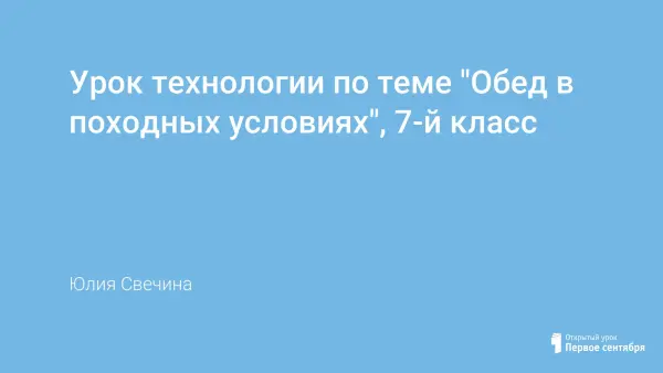 На уроке учащиеся знакомятся с этапами подготовки к туристическому походу. Решают экологические задачи. Учатся составлять меню и готовить обед в походных условиях. Учитель воспитывает у детей бережное отношение к природе, учит рациональному использованию продуктов, сохранению собственной жизни и здоровья в походе. Учащиеся используют знания, полученные на уроках ОБЖ и биологии. Составляют доклады по теме урока. Урок оформлен наглядным дидактическим материалом.