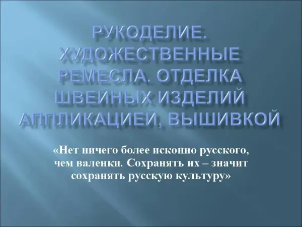 Урок технологии знакомит учащихся со старинной русской обувью – валенками, историей, производством, значением, лечебными и экологическими свойствами. Ученики украшают валенки аппликацией из различных материалов, вышивкой, пайетками, бисером.